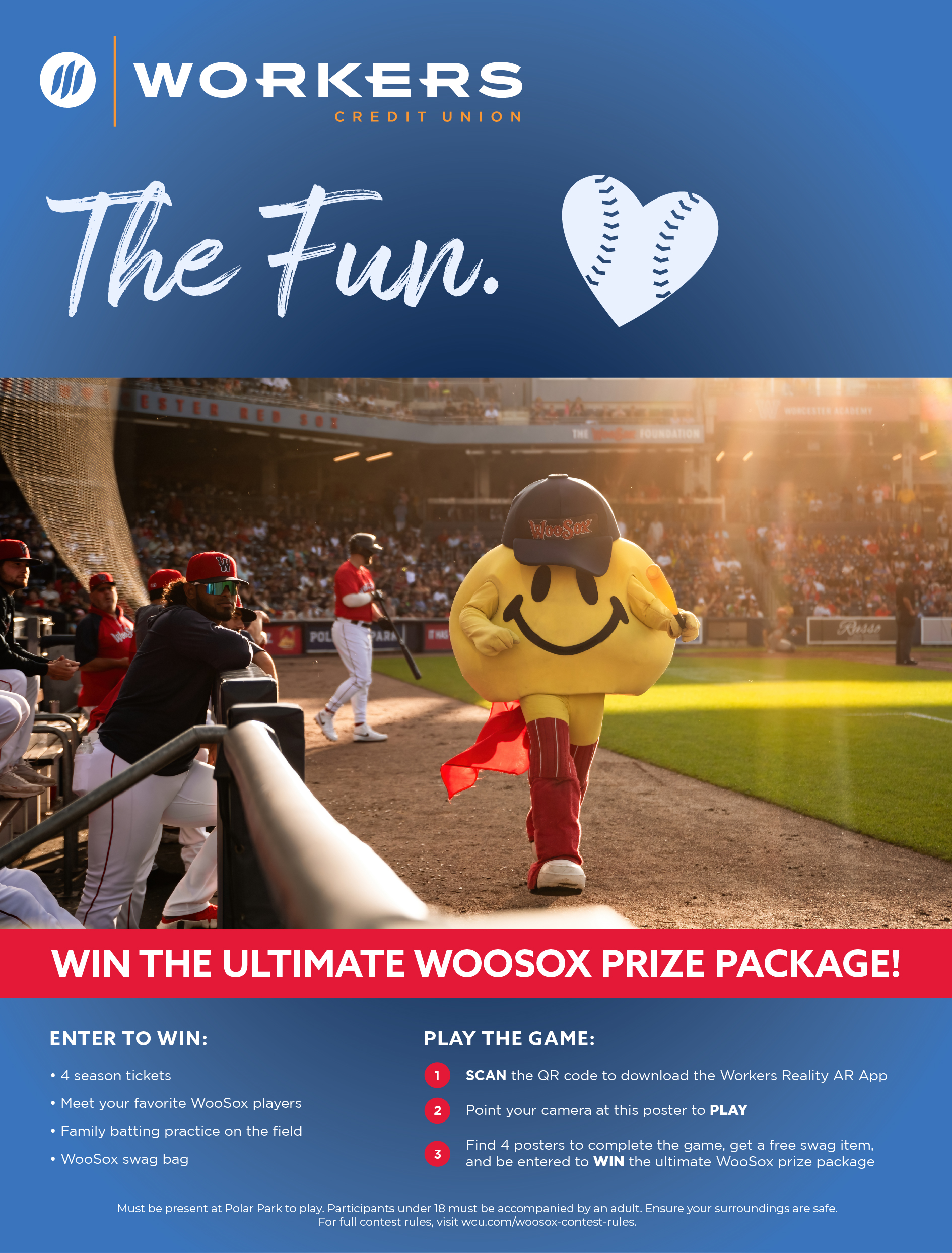 HOW TO ENTER: The Sweepstakes entry period begins at 12:00:01 a.m. Eastern Time (“ET”) on Friday, March 28, 2025, and ends at 11:59:59 p.m. ET on Sunday, September 21, 2025 (“Entry Period”). You may enter the Sweepstakes by downloading the “Workers Reality” app (the “App”) on your smart phone (no purchase necessary) and completing the challenge on the App, which requires the entrant to complete four (4) targets at the Ballpark during the Entry Period (the “Challenge”). Upon completion of the Challenge, you will be entered to win the Sweepstakes. To download the App and enter the Sweepstakes, go to https://www.wcu.com/workers-reality and follow the instructions on the App to complete the Challenge. For an alternative entry, you may go to https://www.wcu.com/woosox-contest-alternative-entry and complete the Alternative Entry Form or you may mail your full name, address, phone number and email address to: Marketing Department, Workers Credit Union, 119 Russell St. Littleton, MA. All entries must be received by 11:59:59 p.m. ET on Sunday, September 21, 2025. We are not responsible for mail or late delivery. Limit one (1) entry per person.