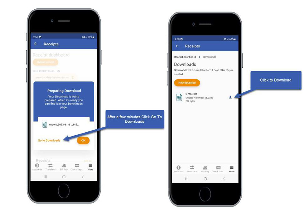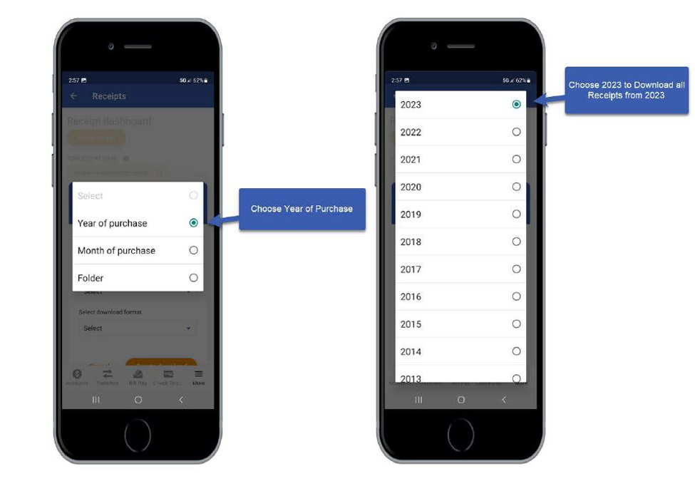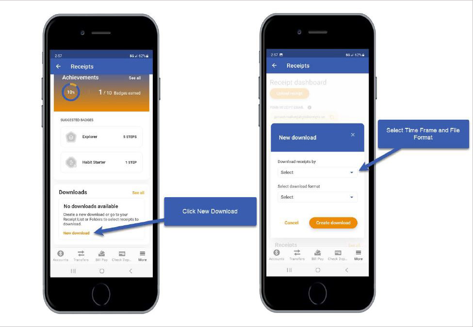 Log into the mobile app and access Digital Receipts. Click New Download. Select the Time Frame and File Format.